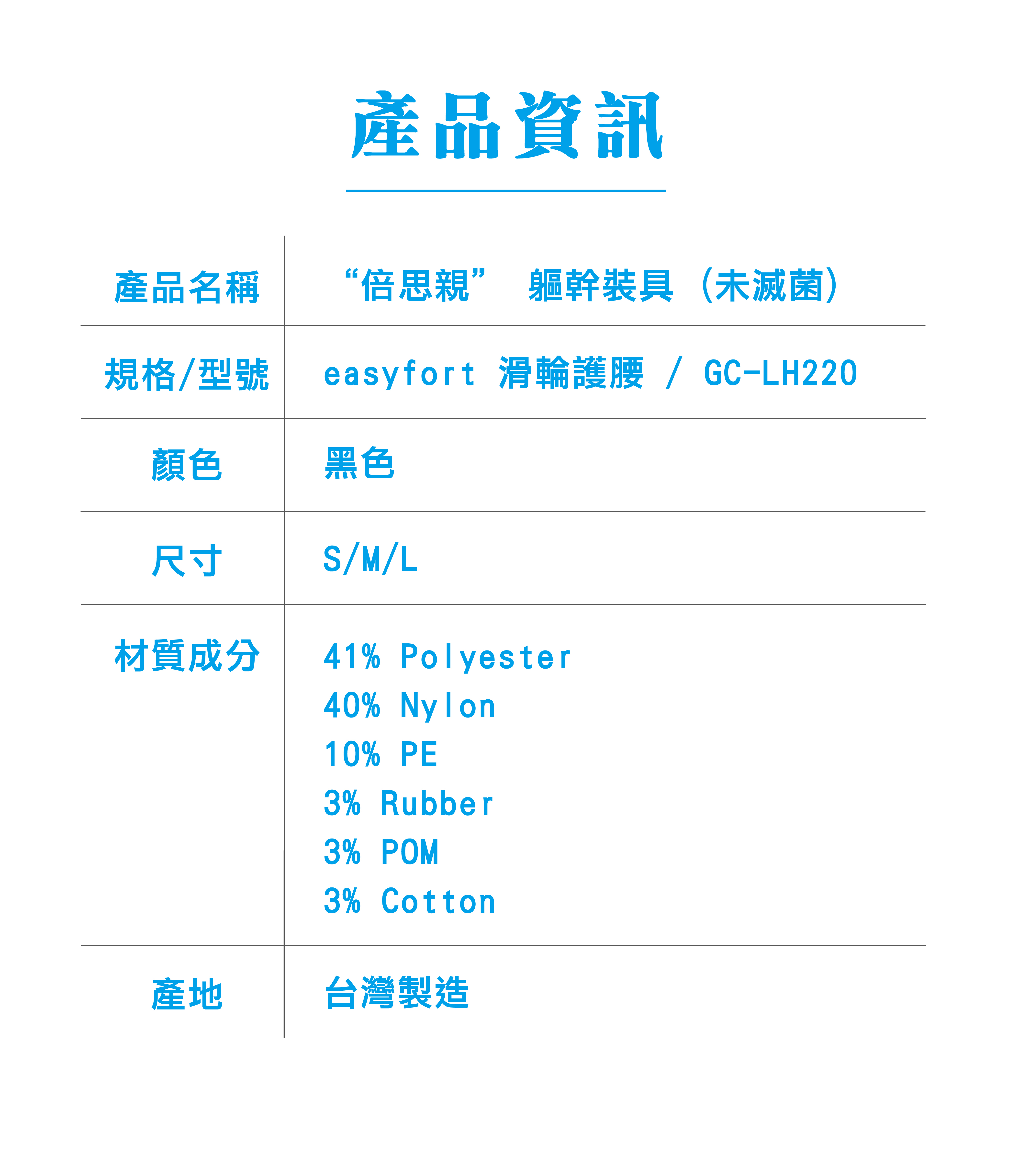 效能: 限醫療器材管理辦法「軀幹裝具(O.3490)」第一等級鑑別範圍